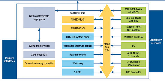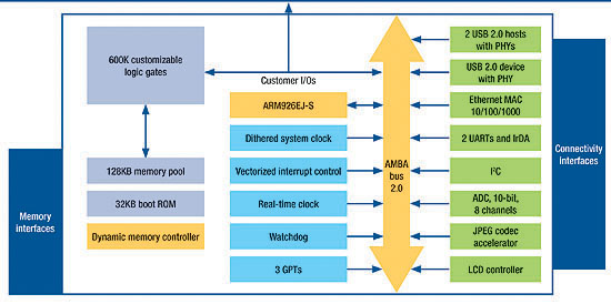DDR/DDR2内存接口兼容DDR2-666 (333MHz)内存,利用相同的引脚可以驱动DDR或 DDR2内存。接口IP模块包括一个支持快速IrDA标准的IrDA接口、以太网MAC和三个USB2.0端口(1个设备端口,两个主机端口)。新的特性功能还包括一个支持分辨率高达1024x768像素的真彩色(24位)XGA LCD显示控制器和一个JPEG编解码器。